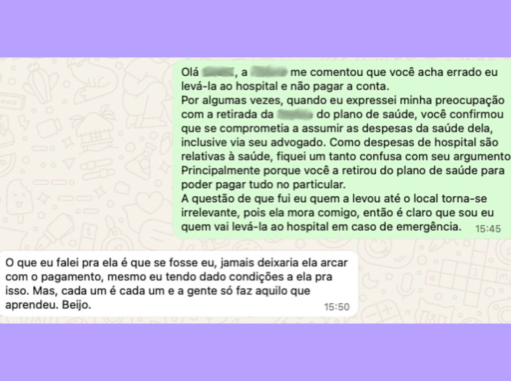 Há 3 anos, ele tirou nossa filha do plano de saúde, dizendo que prefere pagar no particular (ele tem muito dinheiro). Então ele depositava um valor mensal para ela ir gastando com a saúde. Na semana passada, ela passou muito mal e levei-a ao hospital. Na saída, ela pagou com o dinheiro do caixinha para saúde, mas ele ficou brabo, e disse para ela que eu que deveria ter pago a conta, pois eu que a levei então ela estava sob minha responsabilidade. E que não ia mais dar dinheiro para o caixinha da saúde. Então resolvi escrever para ele e aí está a conversa. O que ele refere que cada um faz o que aprende é porque ele tem birra com meus pais e sempre me acusou de que eles não me ensinaram as coisas da vida direito. Mas isto é história para outro post.